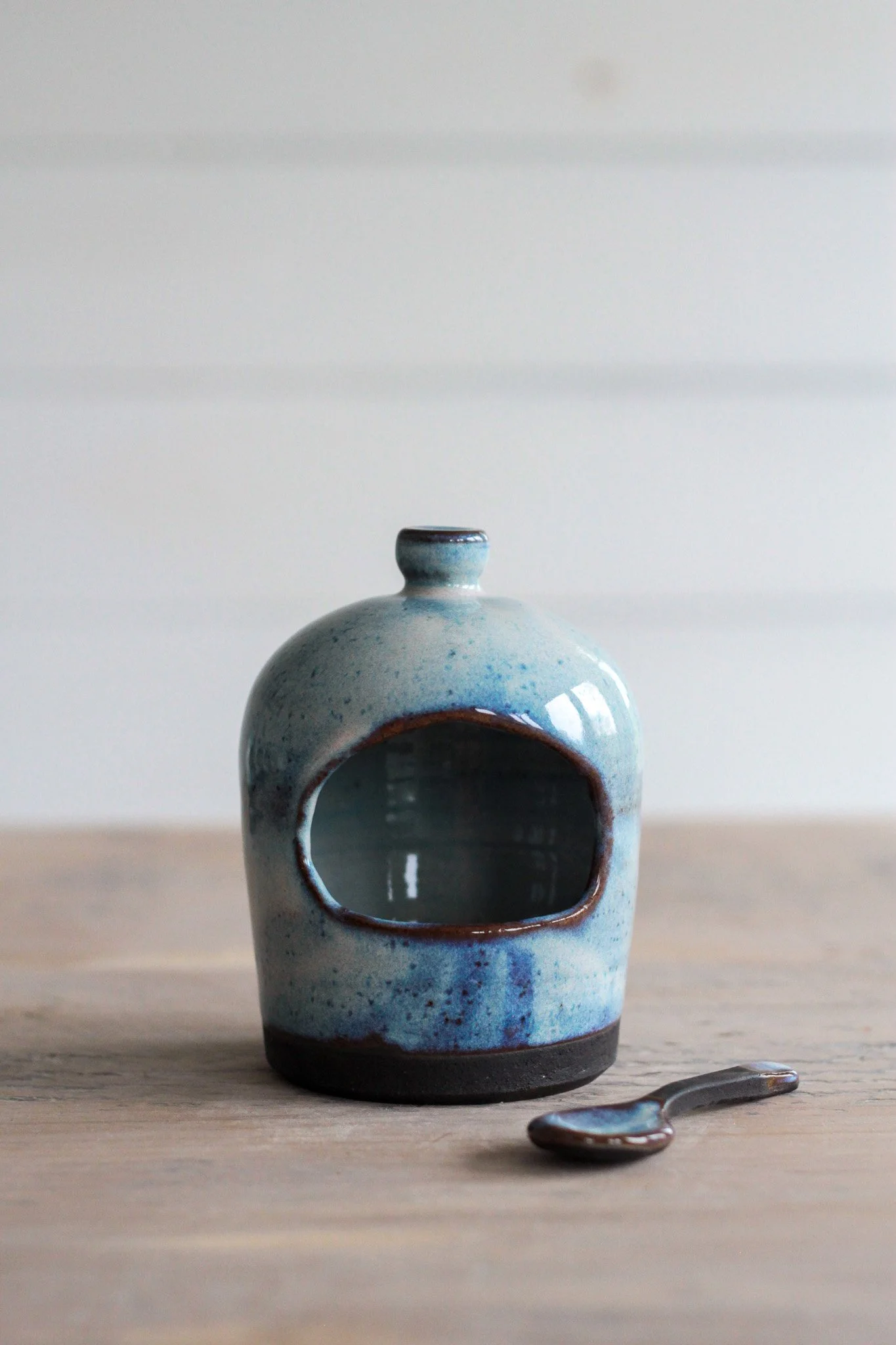 Hand thrown on the wheel in a single piece using black stoneware clay. Glazed in my Glenbrittle glaze; a subtle pale blue base with soft pink hues at the edges. Grey speckles show from the clay beneath. The form is dipped twice; a beautiful effect has been created where the two layers have merged. Fired to 1240 degrees centigrade. My maker’s mark is on the base.